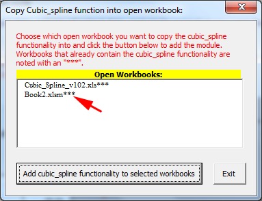 (2) See a dialog appear that contains a list of all open workooks. Asterisks appear next to the workbooks that already contain the cubic spline function. In the example, note that the 'book2.xlsm' workbook does not have the cubic spline function (no asterisks near its name).